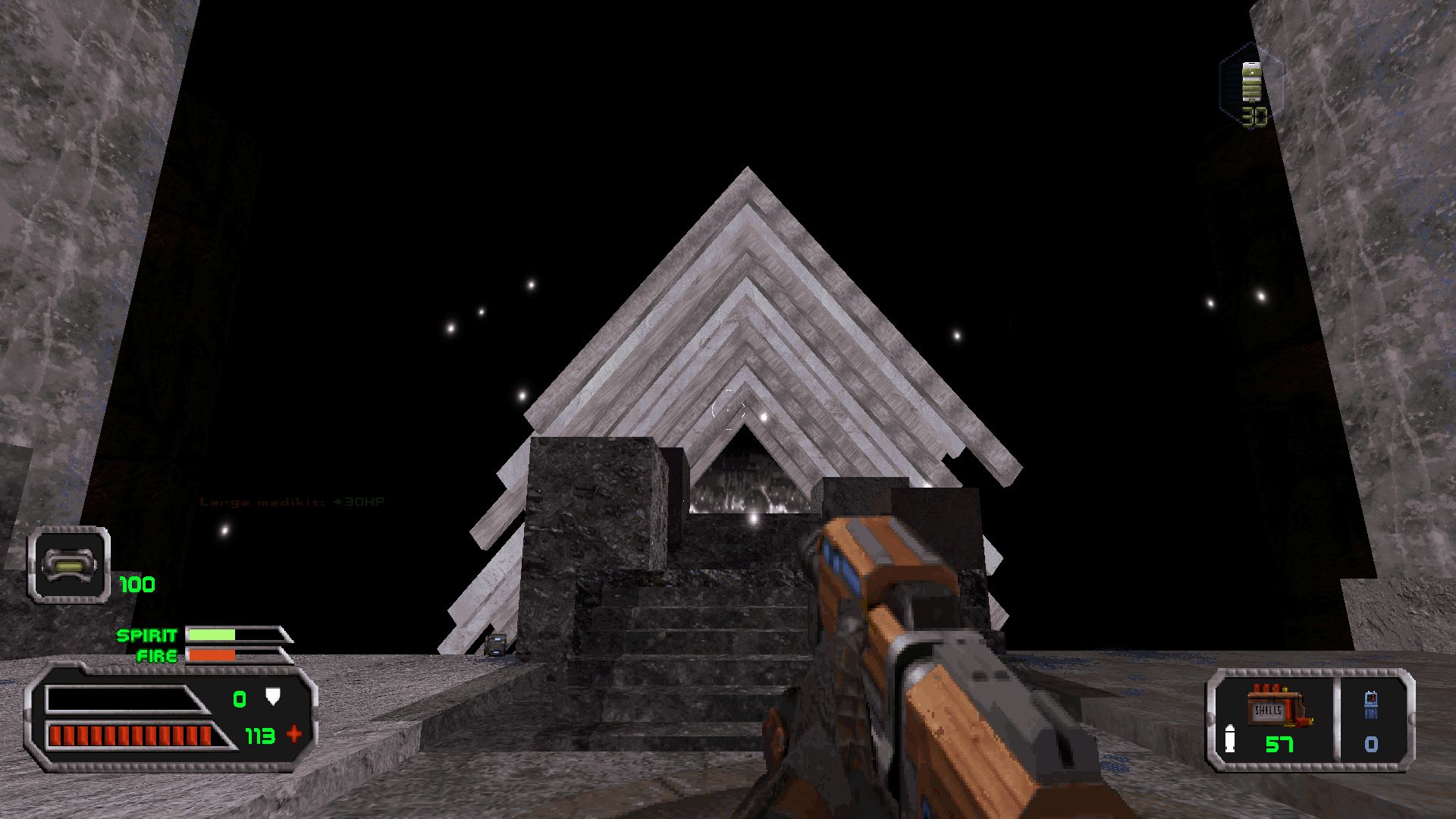 And that's a wrap as far as the maps are concerned. As for the rest, here's a short summary. When picking stuff up I'm still not sure what it is that I'm picking up. Voice acting keeps getting better, but volume levels still need fine-tuning. Gameplay felt more straightforward than in the previous parts, relying less on the player being aware of some obscure mechanic or having the right firing mode/ammo selected. Boss battles too were more forgiving and fair than in the past - with the glaring exception of the final boss. The game's soundtrack is once again a highpoint, being a selection of random free music from the internet and a whole bunch by the team's resident composer, HiveBoss, whose work here includes a few true gems. There are more CGI videos now to convey scenes that'd be difficult to pull off with the game's engine: All this is thanks to Sebabdukeboss22, the resident artist/renderer, who's producing professional-level artwork and videos like there's no tomorrow. Cutscenes are more ambitious now with plenty of cutscene-specific animation frames and such; but way too often the characters just seem to love hearing themselves talk for longer than necessary. The episode also has too much fondness for caves and caverns.