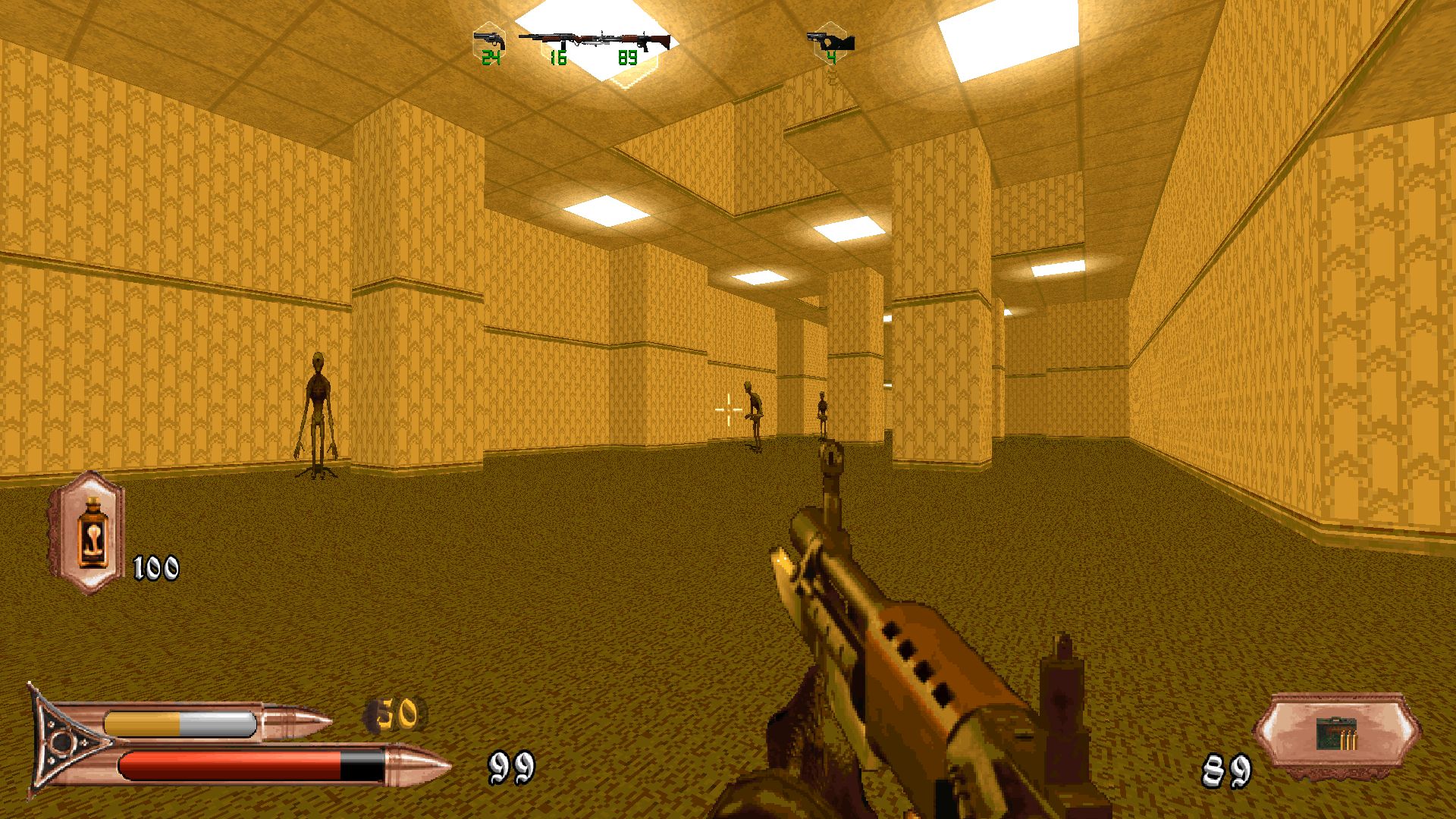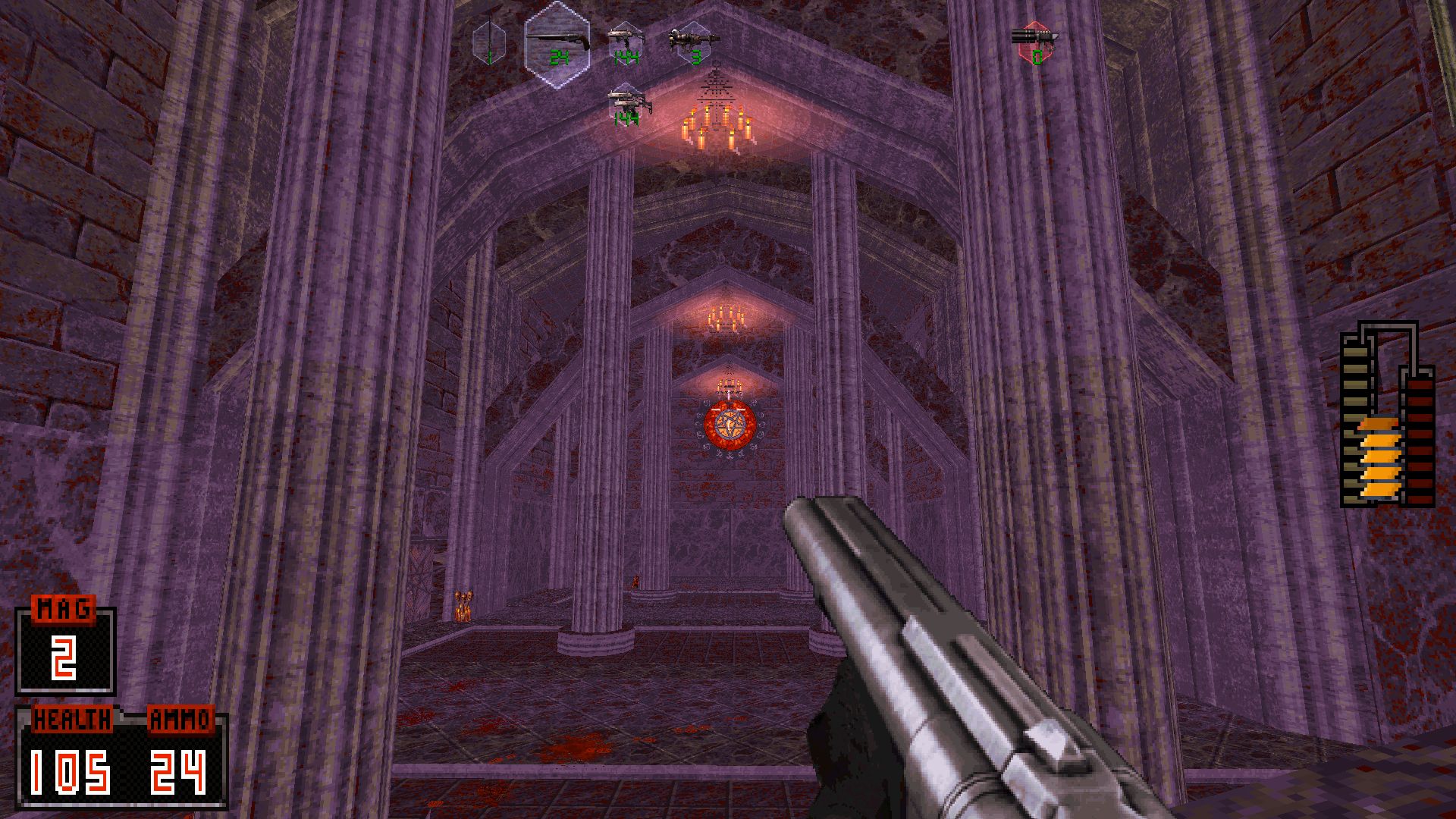 Elysion Fields is a very rare specimen; a map where you progress upward in a seamless fashion, jumping from one sky island to another until you reach the top of the chain. In fact, considering the old limitations of the engine, it's a small miracle we've got a map like this in something derived from the Build engine. No wonder it's from Micky C, the master of TROR. As such, it'll also include a fair amount of tedious walking, but at least this time it's mostly forward with only a small bit of backtracking. Aside from lighting that's a bit flat and some empty-ish buildings, the map is of the awe-inspiring sort, a sensation accentuated by a fitting soundtrack. Along with some of Snowfall's stuff, this is the most technically impressive map in the episode. Gameplay is rather straightforward; you need to break some statues to unlock the next jumppad to reach the next island and so on. Combat is also pretty easy; the map relies on enemies with relatively slow-moving projectiles, so avoiding getting hit becomes trivial when you've got some much space between you and the enemy.