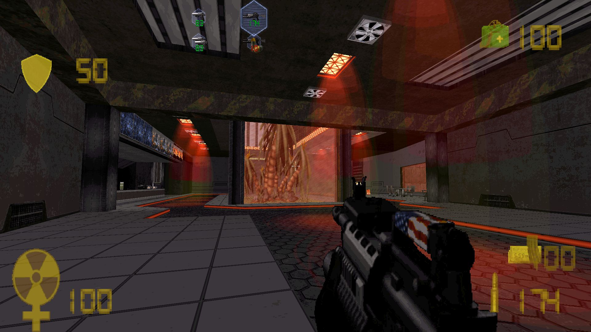 the flamethrower against certain organic... things (as if the mininukes in your arsenal with