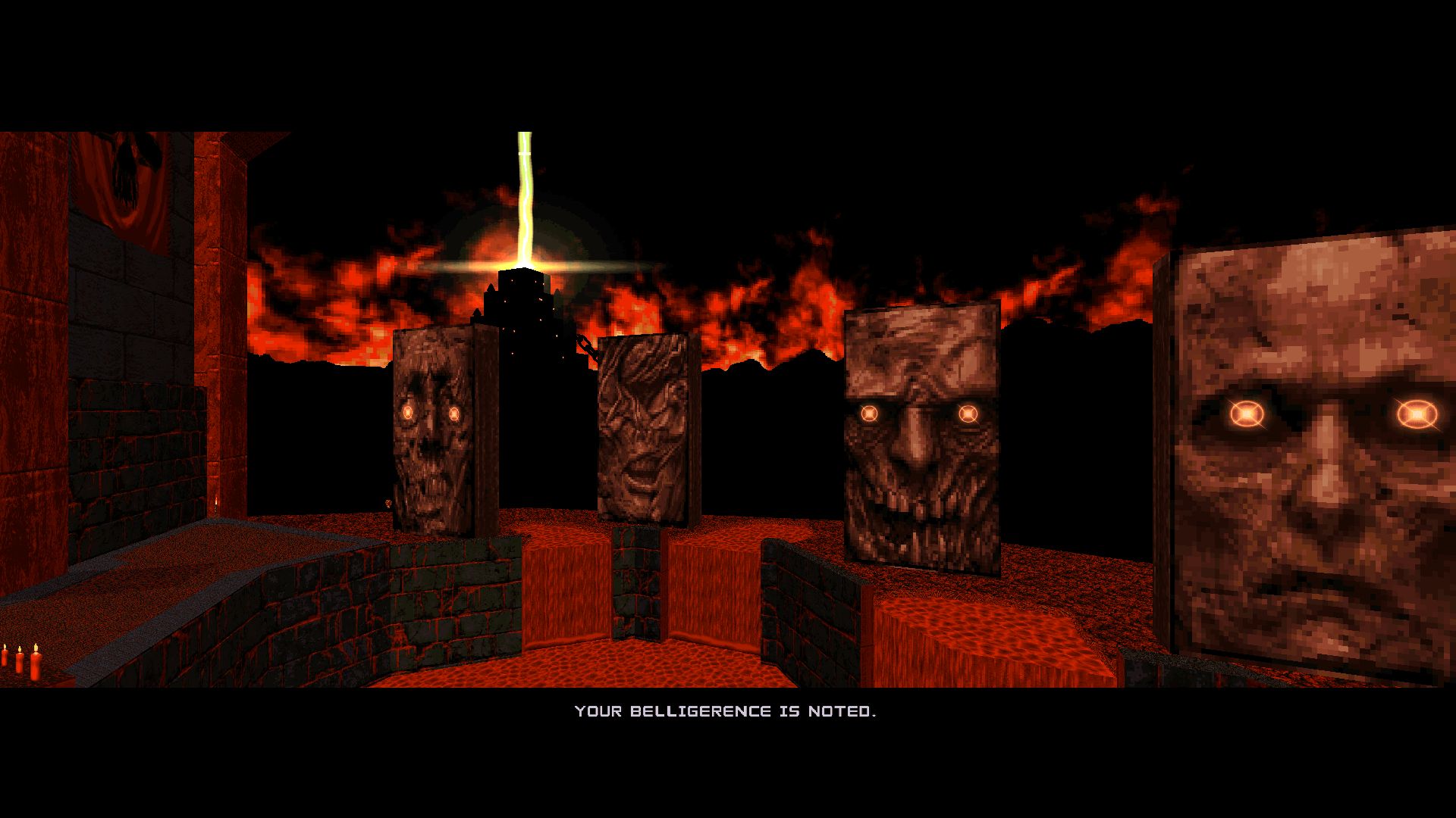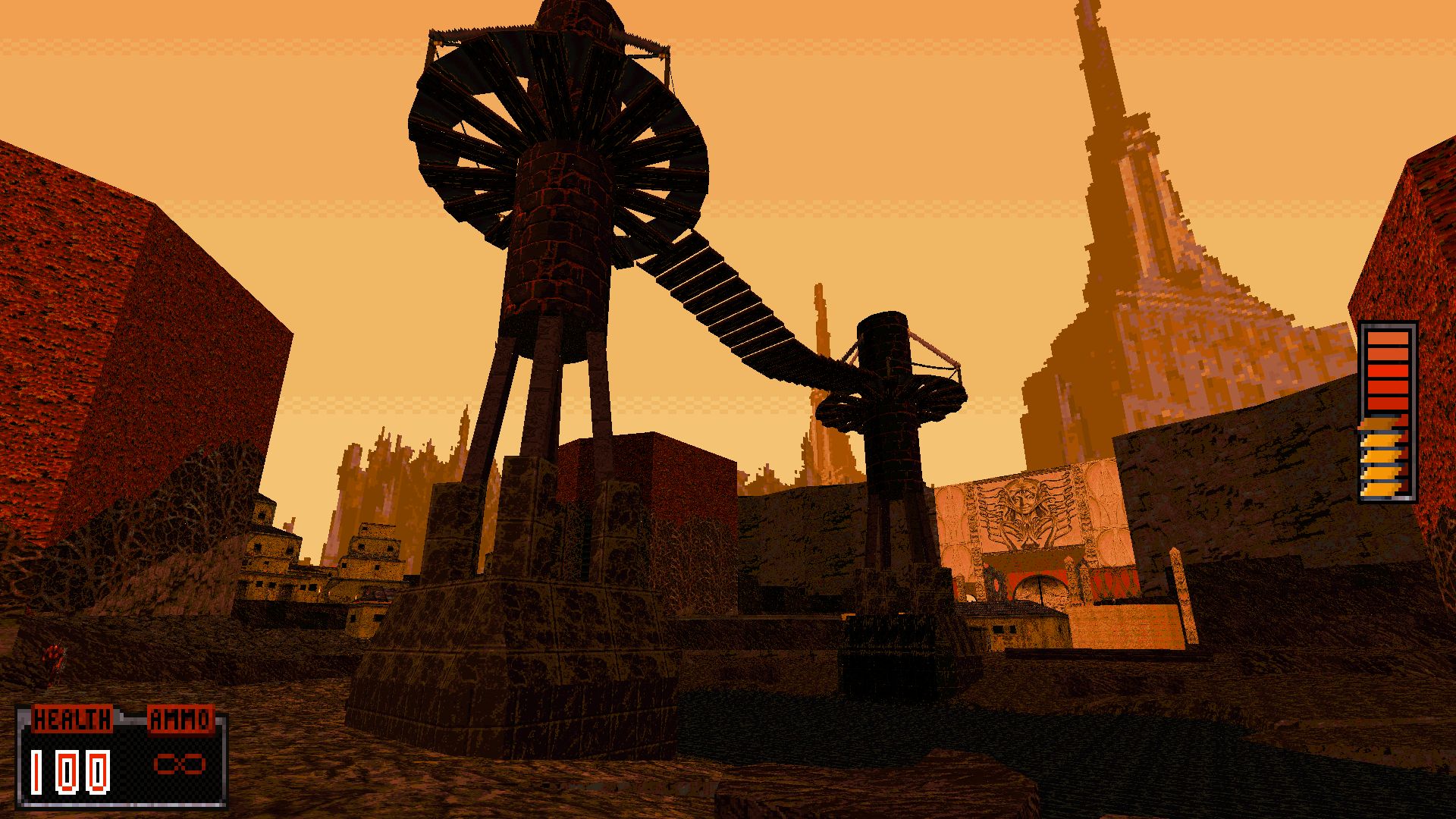 A return to the Egyptian theme of the third episode, Jolteon's Great Obelisk is a Serious Sam type of map with some discernible Powerslave/Exhumed influences as well. Here you'll get plenty of open spaces and not a lot of cover, so strafing is the key in combat. The map takes place at night, but visibility is not an issue; while I often complain of darkness issues due to the level of sunlight in my room, this map is well playable even in the middle of the day. The night-time palette is lovely; combined with the sky and the fires of the temple I got some heavy Unreal vibes from it as well. The map's symmetrical nature also makes it very simple (and consequentially somewhat repetitive) to navigate with tiny puzzles to solve per each section. Overall a fun-to-play map that doesn't overstay its welcome.