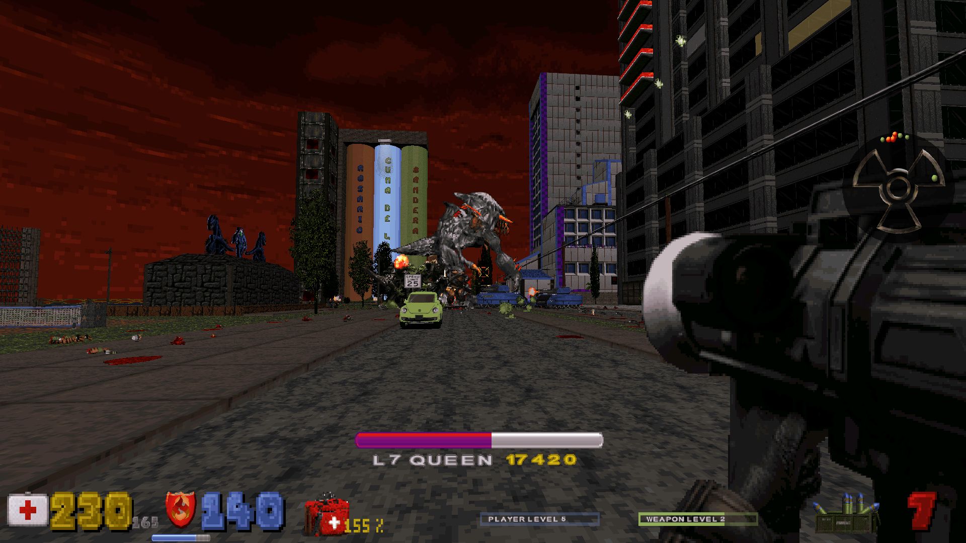 At 30 minutes long, Rosario 5 is only a slightly shorter map. It's mostly focused on rooftop action; here your new glide ability is put to good use. I've always kinda liked the idea of a rooftop-focused map; I even made one myself a long time ago (unreleased as far as I can remember) and have occasionally flirted with the idea of remaking it. The section is quite linear for obvious reasons, and includes a lengthy journey back where you get to rely on jump pads for ease of travel. I thought this section injected some much-needed variety into all the regular action, and none of the jumping and gliding ever got irritating. Design is impressive; the author is very good at detailing buildings' exteriors. You can tell the influence of real-life locations in pretty much everything you come across. There are plenty of decorative details too, especially at street level, but there's a downside to all this; all the colors and decorative sprites make for visuals that can seem too distracting and "busy" to the point that it's often hard to spot enemies until you start getting hit. Aside from that, gameplay is pretty well balanced so that switching weapons becomes essential. A motorcycle makes an appearance too, but it felt like a useless gimmick.